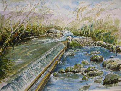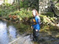 Flow measurements at the footbridge upstream of the Jumb Falls on the River Kent. The flow measurements illustrated were carried out in 2007 as part of a Durham University final year M.Eng. project and were not carried out by the Kentmere Hydro Trust, which did not exist at the time.